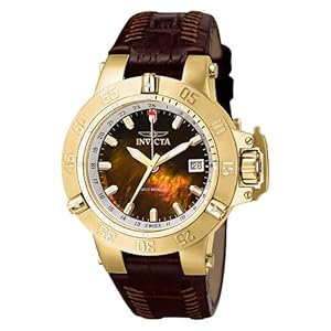 The Invicta Women's Exclusive Subaqua Collection Noma III GMT Gold-Tone Watch's richly detailed brown leather band and shimmering brown dial complement the stainless steel bezel's warm gold tones for a sophisticated look. This exquisite timepiece's stainless steel case offers a coin-edge flip-lock crown. It is topped by a gold-tone stainless steel unidirectional bezel with raised Arabic numeral minute markers in five-minute increments. The dial displays black 24-hour markers on a white inner ring, as well as arrow-shaped, luminescent hour indicators and white stick minute markers. Luminescent hands and a date window at the three o'clock position round out this sophisticated, sporty timepiece. This watch arrives in a yellow Invicta gift box and is water resistant to an impressive 1,640 feet (500 m).