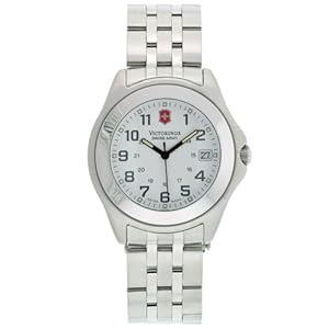 Stainless steel case and bracelet. Polished stainless steel fixed bezel. White dial with 3 hands and date window at 3 o'clock position. Quartz movement. Scratch resistant mineral crystal. Case diameter - 42 mm. Case thickness - 11 mm. Water resistant at 100 meters / 330 feet. Victorinox Swiss Army White Mens Watch 241283.CB