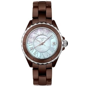Instant Karmica is gonna get you. The perfect accessory to a lovely evening gown, this luxurious women's timepiece is elegant in its simplicity. Framed by a unidirectional bezel, the white mother-of-pearl dial takes center stage and features luminous hands, Roman numeral hour markers, and a date display at the three o'clock. The band and case are crafted from a beautiful brown high-tech ceramic and stainless steel. Powered by precise Swiss-quartz movement, this exquisite women's watch is water resistant to 330 feet (100 M).