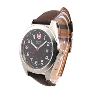 All Stainless Steel Case & Buckle * Casual Genuine Leather Embossed Brown Stitched Band * Analog with Luminous Glow In Dark Hands * Classic Round Black Face w/ Matte Finish Silver Bezel * Date at "3" Position * EZ Read Large White Numbers * All Stainless Steel Case & Buckle * Analog with Luminous Glow In Dark Hands * Date at "3" Position * EZ Read Large White Numbers * Screwed Down Case Back * Rotating Red Second Hand * Official Swiss Army Emblem at "12" Position & On The Case Back & Buckle * Precision Swiss Quartz Movement * Quality Swiss Made * 10 ATM - 100 m - 330 ft - Water Resistant * Scratch Resistant Mineral Crystal * Guaranteed 100% Authentic Victorinox Swiss Army Watch ****Watch Stats**** [FACE] * Style: Analog * Shape: Round * Size: 1-1/4" * Color: Black * Hands: White Luminous * Hour Markers: White Numbers * Misc: Rotating Red Second Hand Date at "3" Position Official Swiss Army Red Emblem at "12" Position Glow In Dark Hands Screwed Down Case Back [BAND] * Material: Genuine Leather * WristSize: 5" to 7" * Width: 1/2" * Color: Brown * Clasp: Buckle Clasp * Misc: Official Swiss Army Emblem on Clasp
