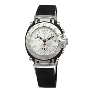 Stainless steel and black resin case with a black rubber bracelet. Silver dial with luminous hands and markers. Date displays at 3 o'clock position. Chronograph - three sub-dials. Tachymeter. Scratch resistant sapphire crystal. Quartz movement. Water resistant at 100 meters (330 feet). Tissot T-Race Ladies Watch T011.217.17.031.00