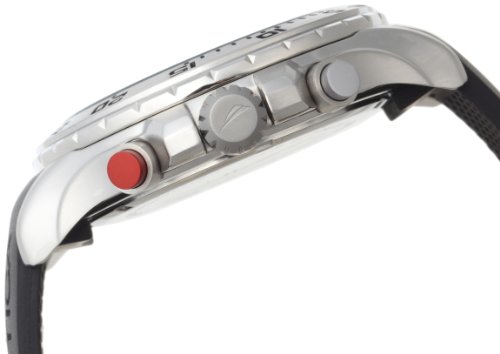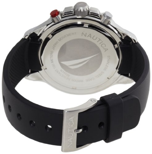 Sporty and elegant: the watch has a black strap with Nautica logo resin and stainless steel. Tachometer bezel. chronograph black dial with logo, date window and three counters. Chronograph. Water resistant to 100 feet of water water. Five-year warranty