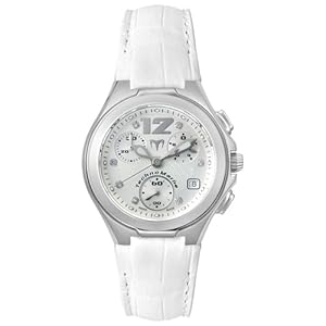The elegant TechnoMarine women's Neoclassic Diamond Chronograph watch will complement your sophisticated business and casual wardrobes. Constructed with a 33.5-millimeter stainless steel case, this stylish timepiece includes a circular stainless steel bezel, and a 12-millimeter (at the case lugs) white alligator-leather wristband with an adjustable buckle clasp. The sleek silver dial face is protected by a scratch-resistant sapphire window. Diamond hour indexes encircle the dial, as well as a silver-tone Arabic numeral at 12 o'clock. A date calendar sits at four o'clock, while three discrete sub-dials line the face for increased functionality. The Swiss-quartz-powered timepiece is water resistant to 330 feet. It comes with a 2-year limited manufacturer's warranty.